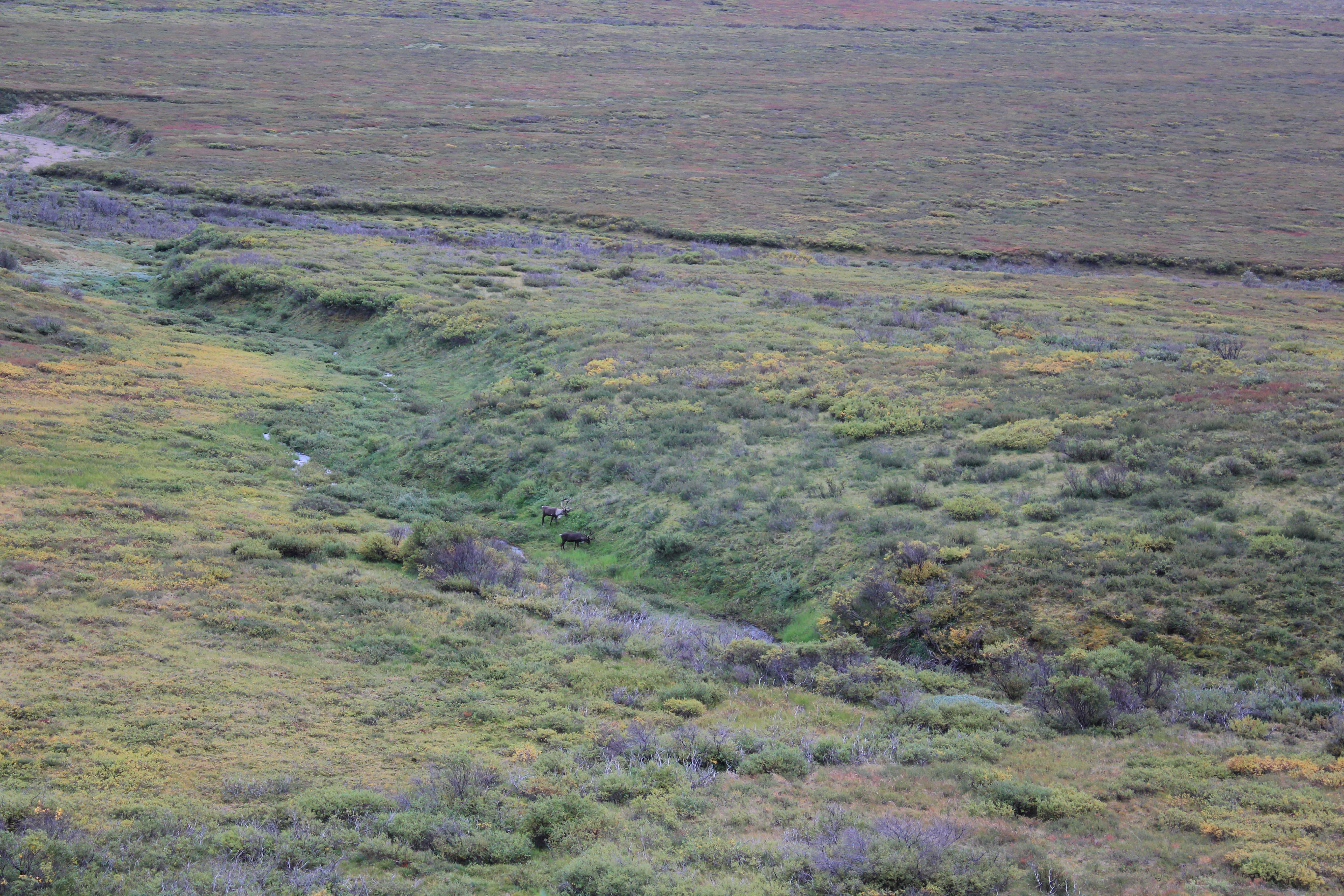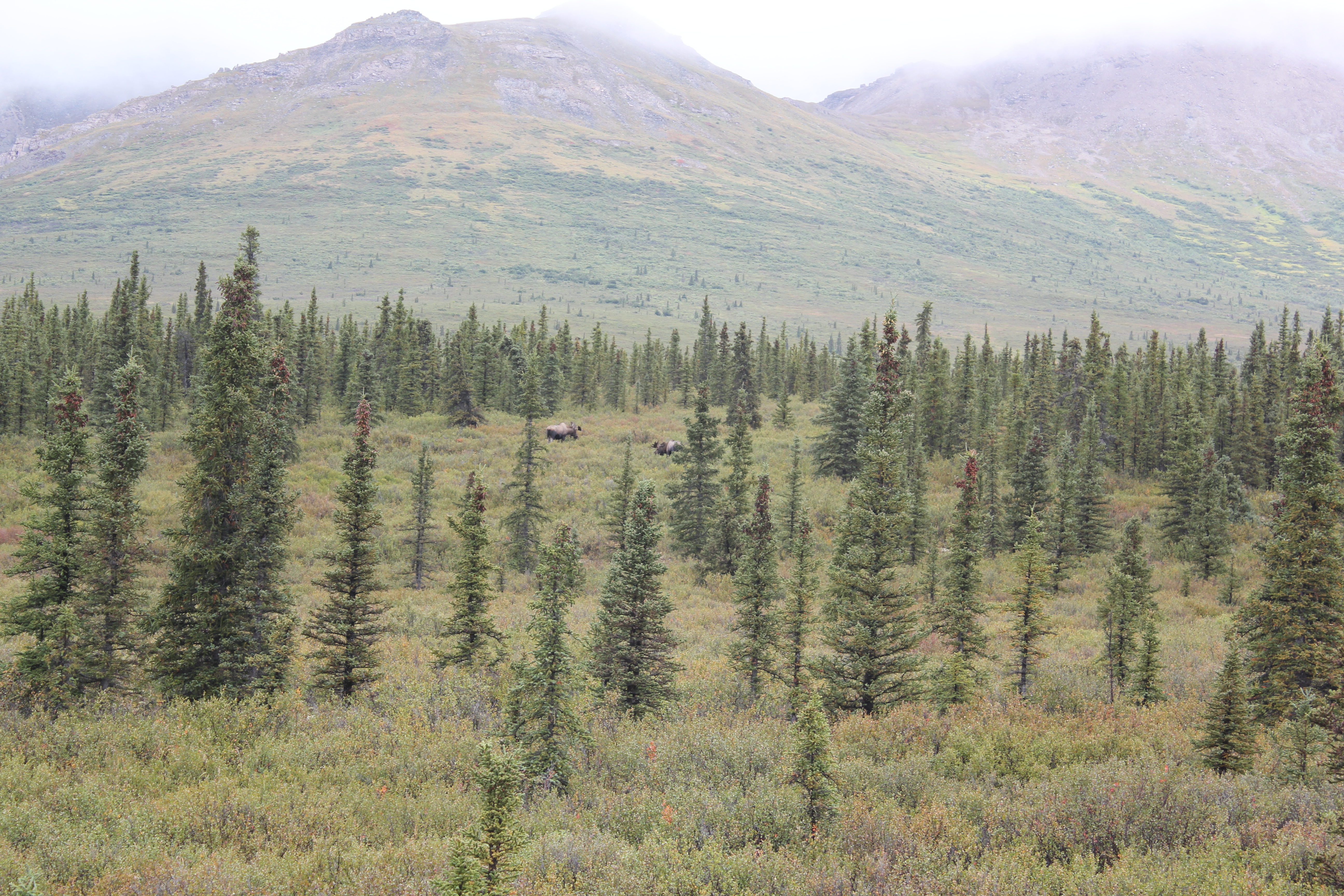 Despite the weather, the wildlife was abundant. The first we saw were the moose. According to the rules, the bus can stop, and we can open windows, but we must be quiet and not stick any body parts out of the windows.