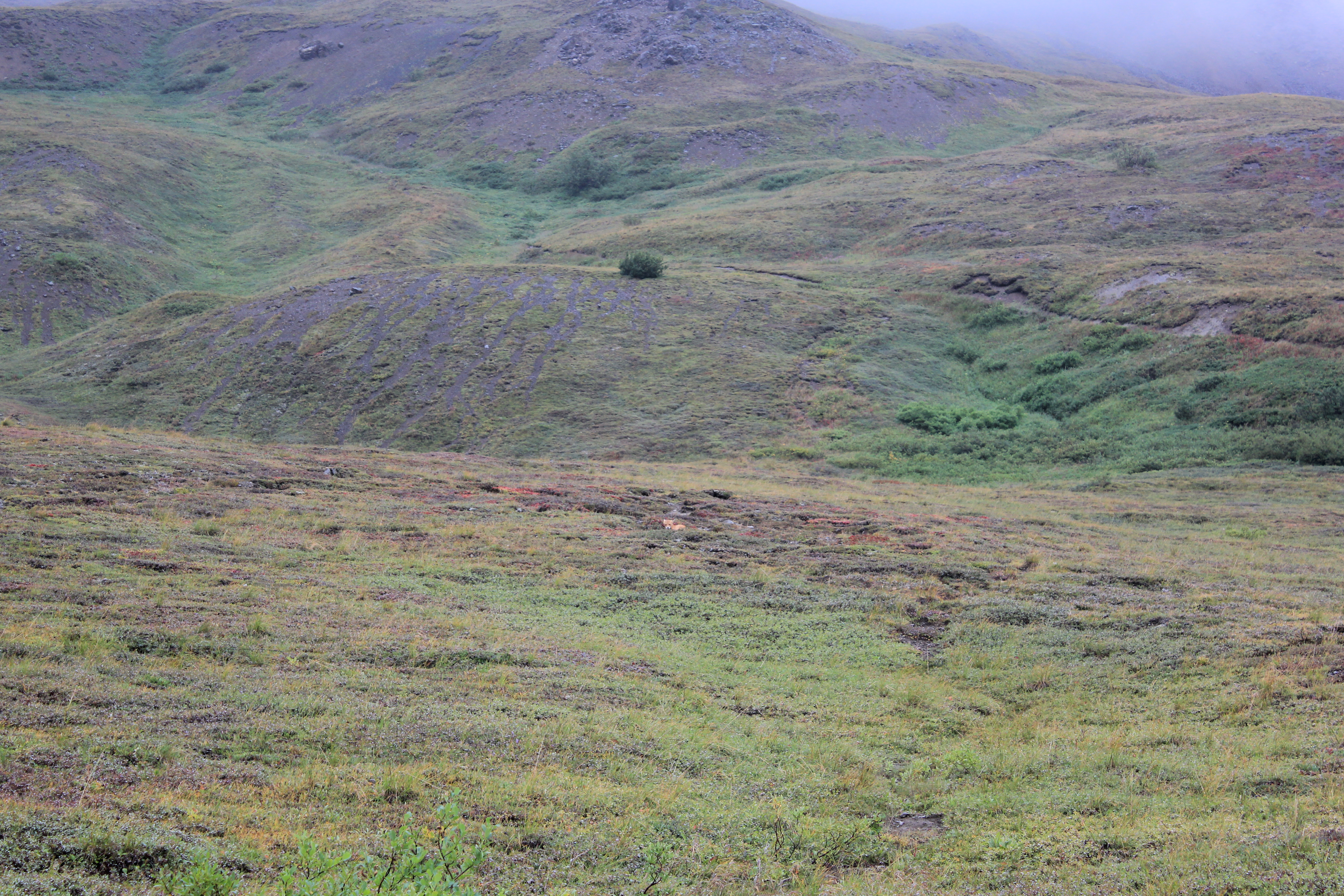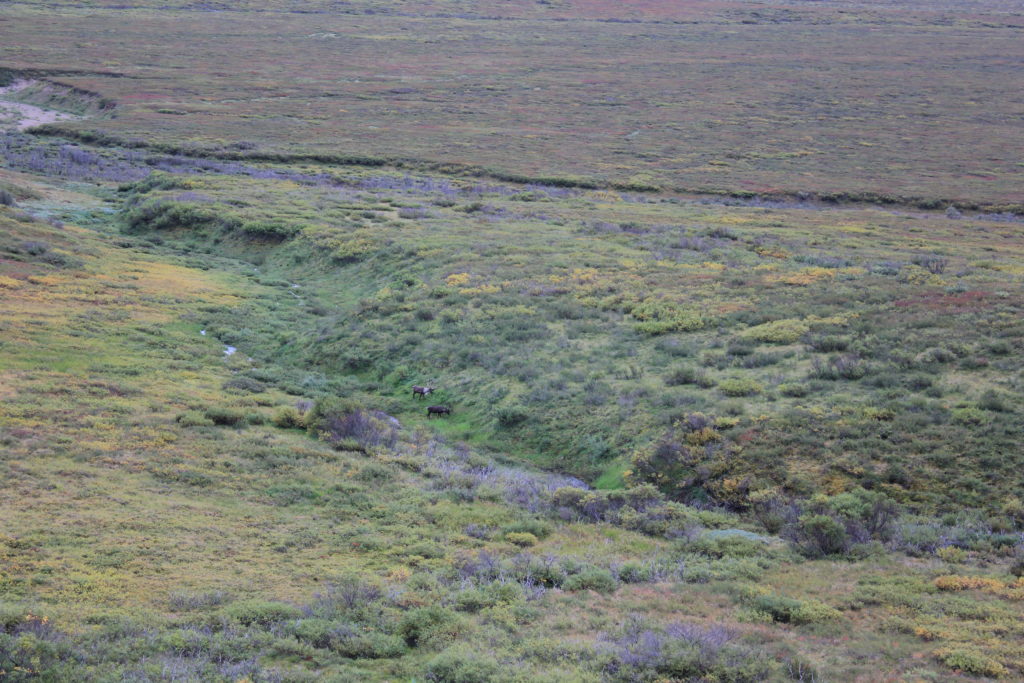 The next thing we “saw” were Dall sheep. If you look closely at the center of the picture you can see about 10 small white dots. Using binoculars we were able to see them clearly, but I did not have a camera lens that could capture them. There’s about 2500 sheep in the park.
