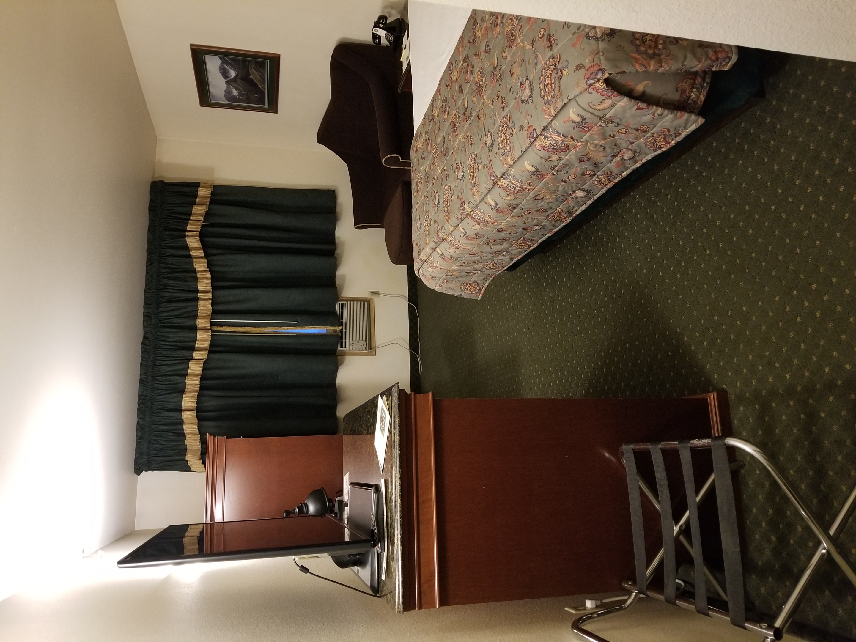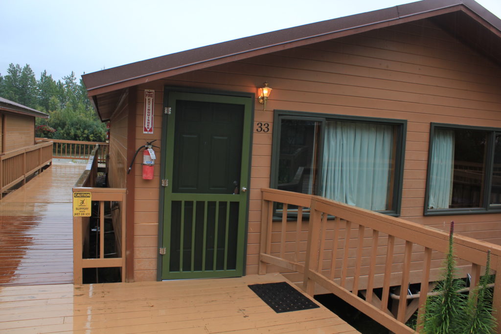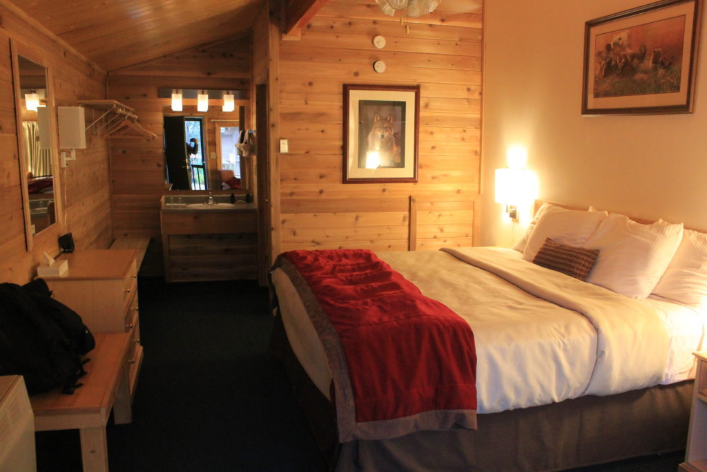 It was rather homey and comfy. A small flatscreen TV and a wall sink were to the left and the toilet and small stand-up shower are off through the door to left. There is a small but nice restaurant onsite, with a large lounge with couches and tables.There wasn’t much to see as it’s all forested, and overcast and rainy.