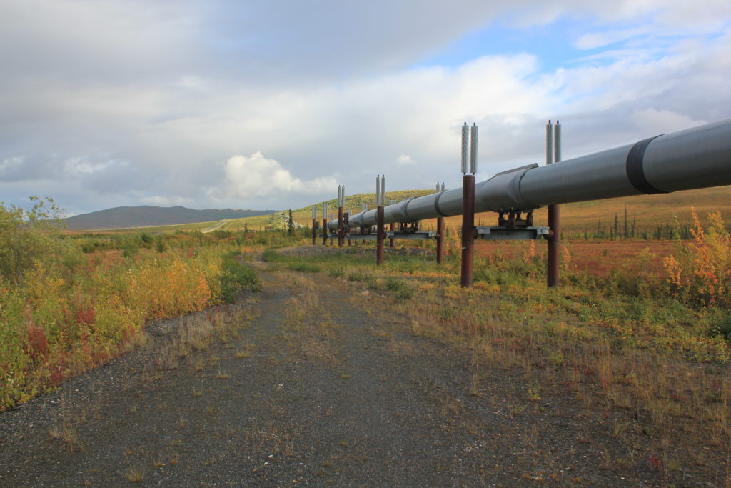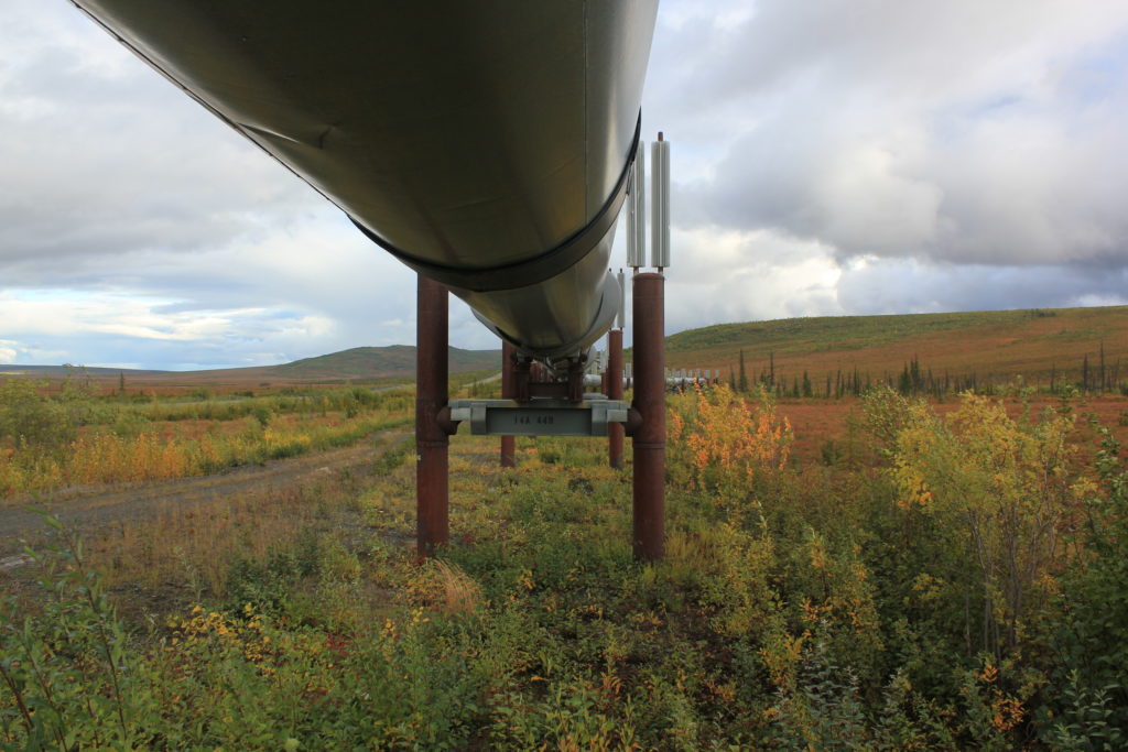 The oil runs hot through the 48 inch wide insulated pipe. It’s designed to be able to move due to temperature expansion and earthquakes. Each stanchion has a set of thermosyphons that conduct heat from the oil to the fins at the top in order to prevent thawing of the permafrost on which they are built.