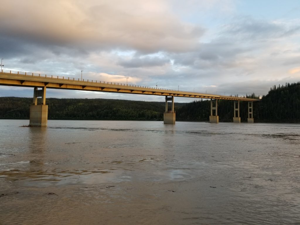 The Yukon bridge crosses the Yukon River at Mile Post 56. The pipe crosses the river on the other side of the bridge.