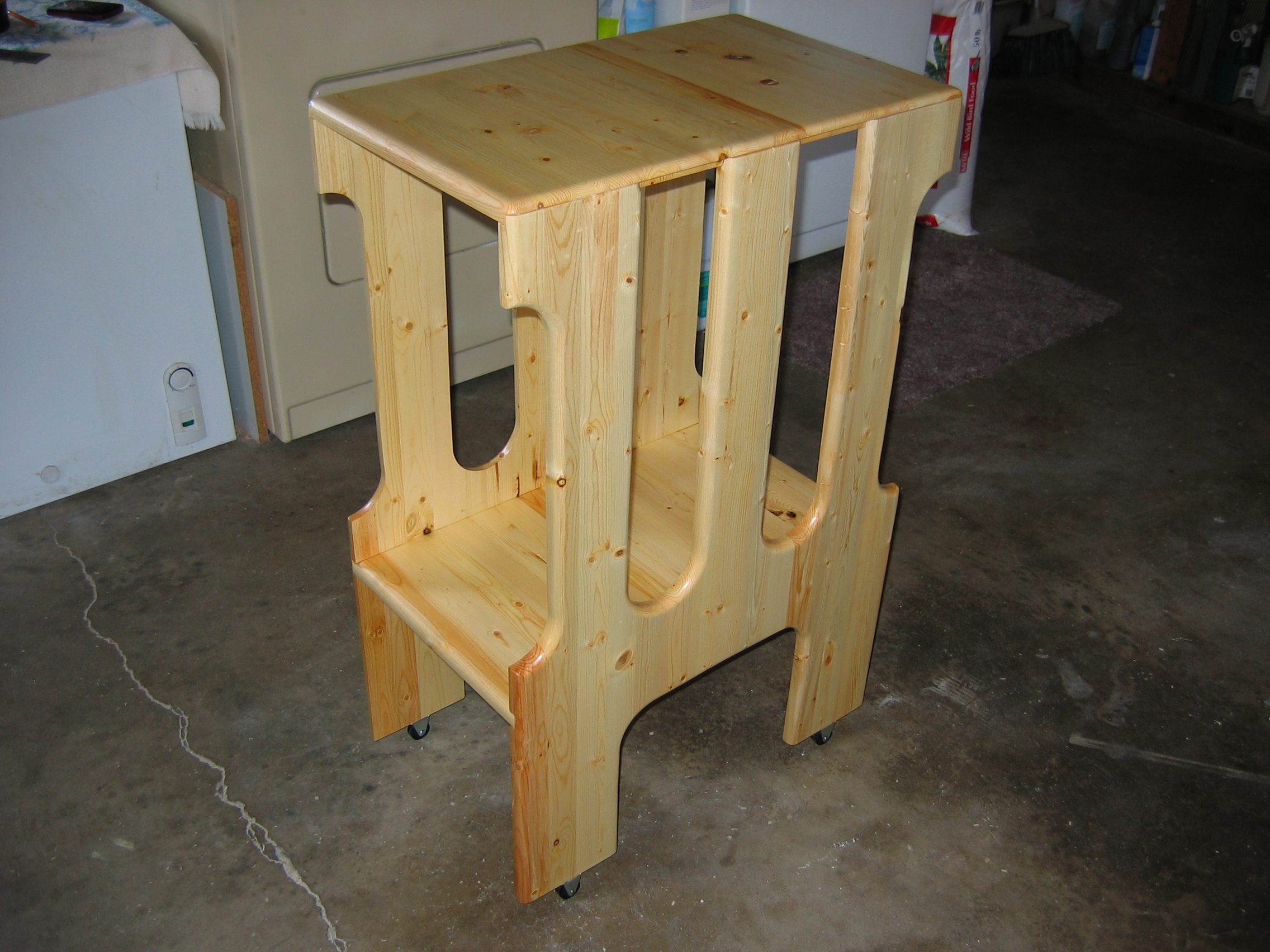 She also needed a small storage table that would slide between her fridge and stove. I made this storage cart on wheels out of knotty pine.