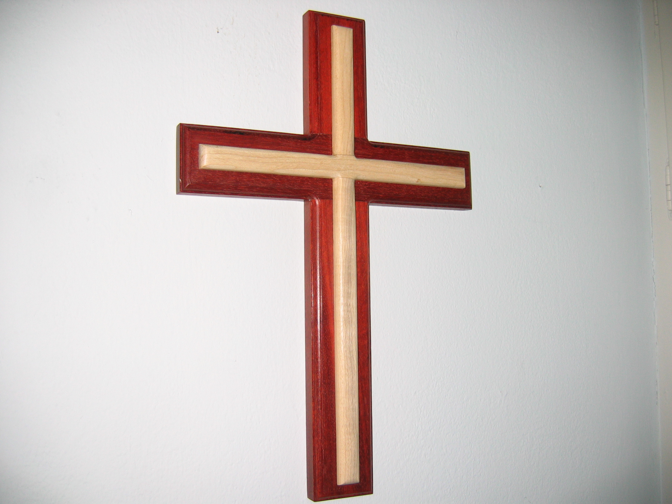 I made this cross for a friend out of bloodwood which has a natural dark red color and the inlay is made from myrtlewood.